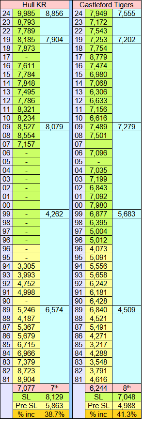 In the chart, Hull KR was in a lower division for quite a few years, Castleford less so. That doesn't affect the average as only years that the team was in the top flight competition count. The green column is annual averages and the blue column is the average over each decade. Covid didn't allow the years 2020 and 2021 to be included.