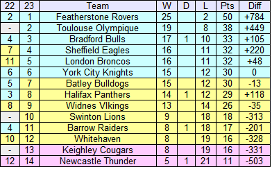 The top six are shaded in pale blue below, the Halifax Panthers a surprise omission. The two sides to go down as shaded pink, Keighley after one season and Newcastle after three seasons. Sadly, Newcastle won't be going down to the lower level but at best into a regional league.